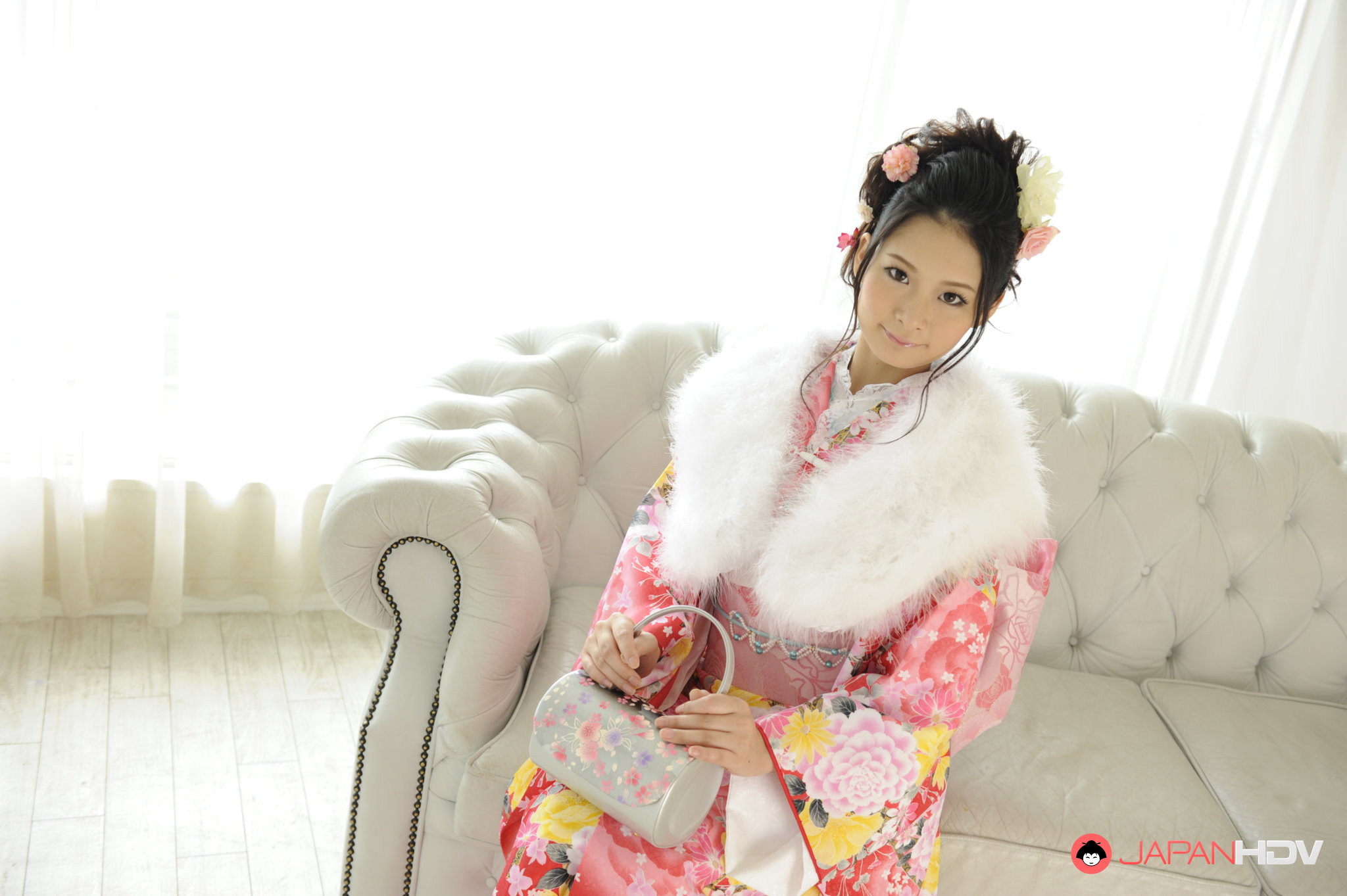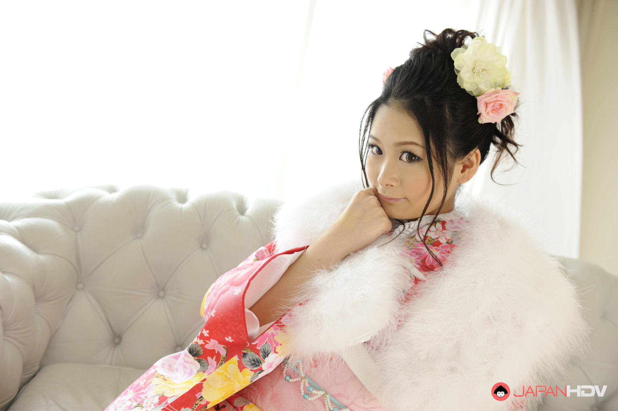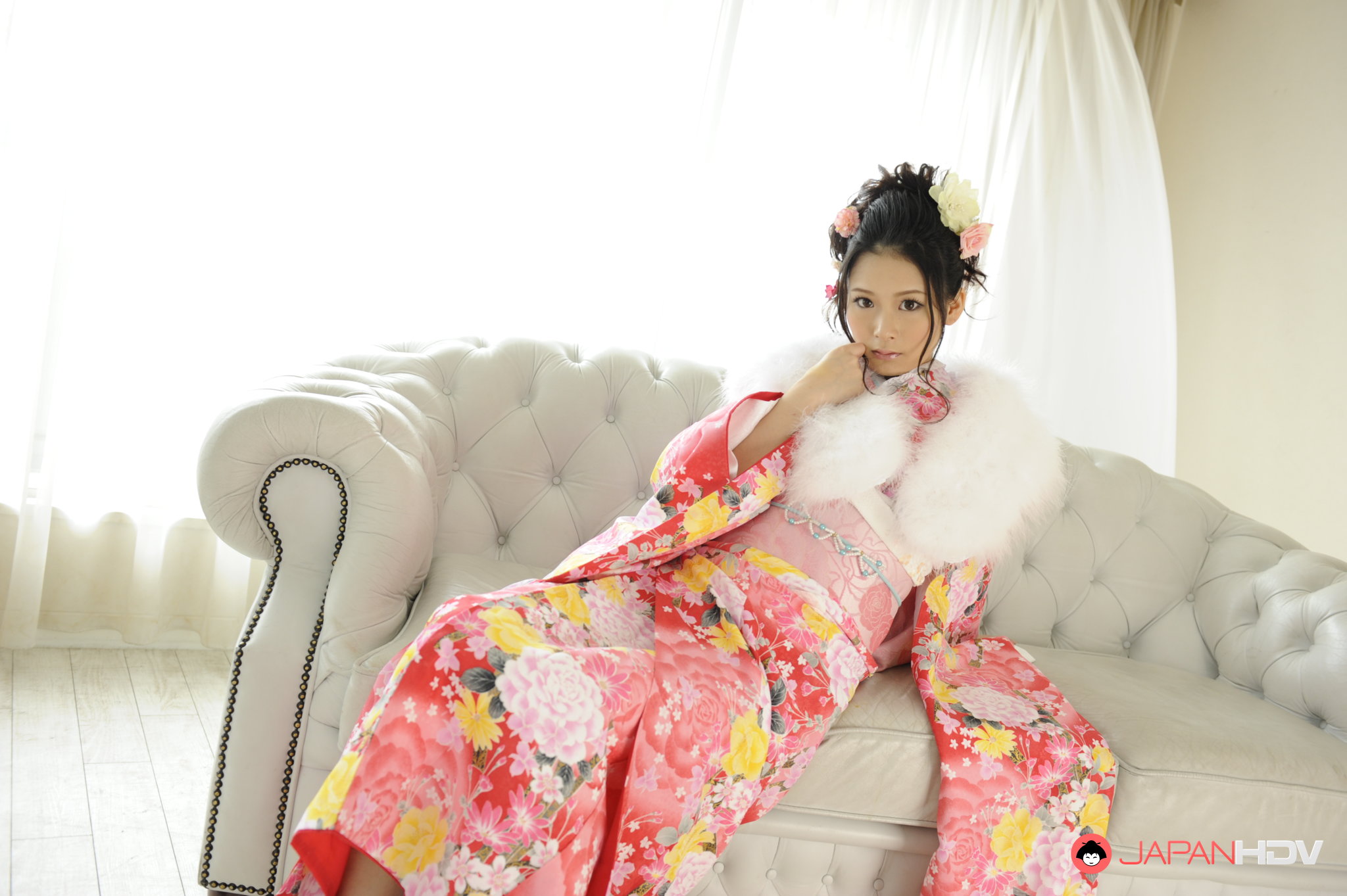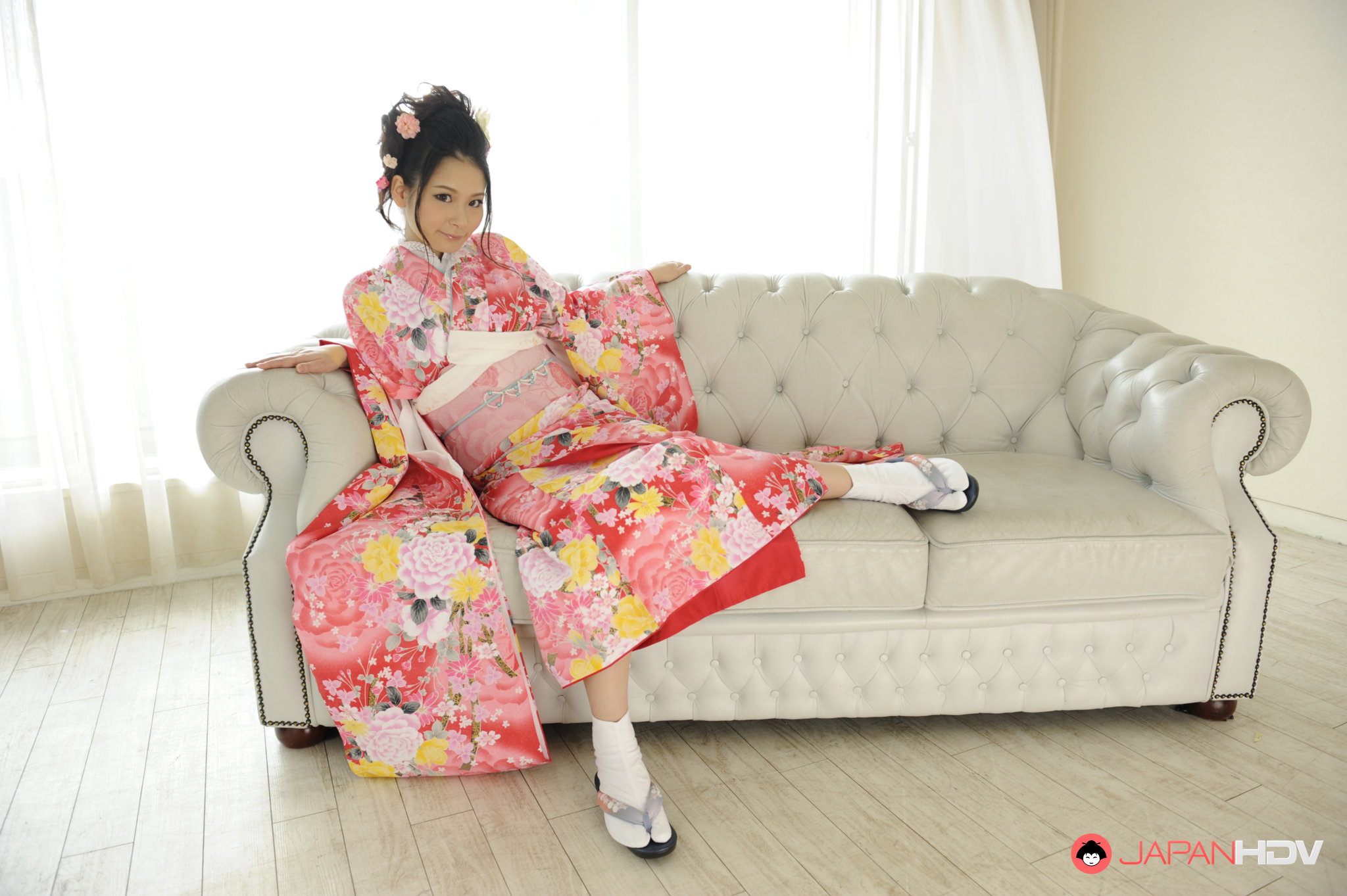 Ako Nishino relaxes on a big white couch. She pulls her kimono open to show off her tits and hairy pussy.