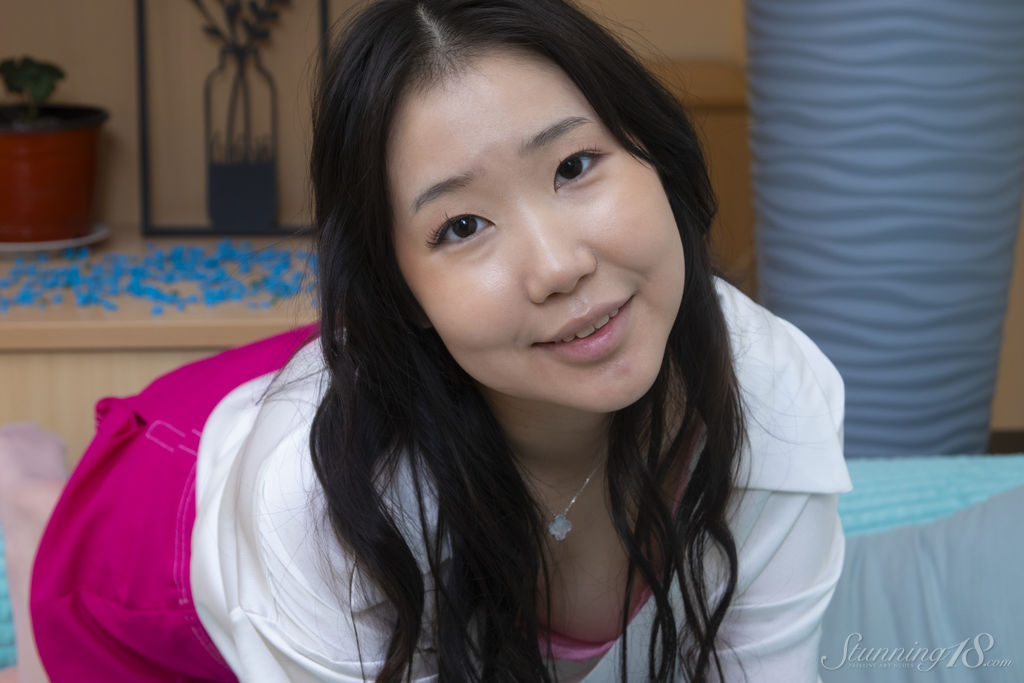 Anna Abit is naked on a bed, using a dildo to pleasure herself. She looks relaxed and enjoys the moment with a smile.