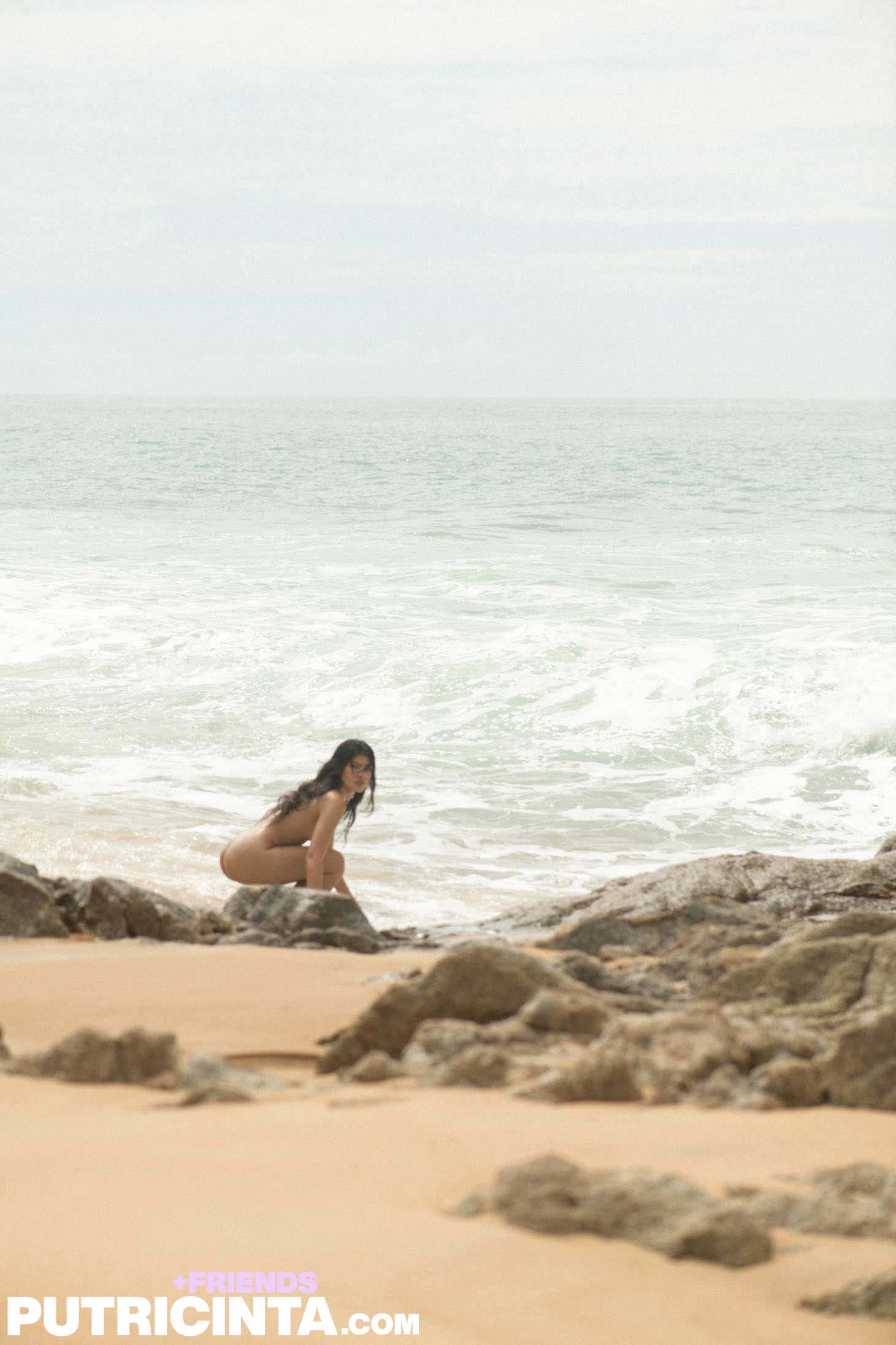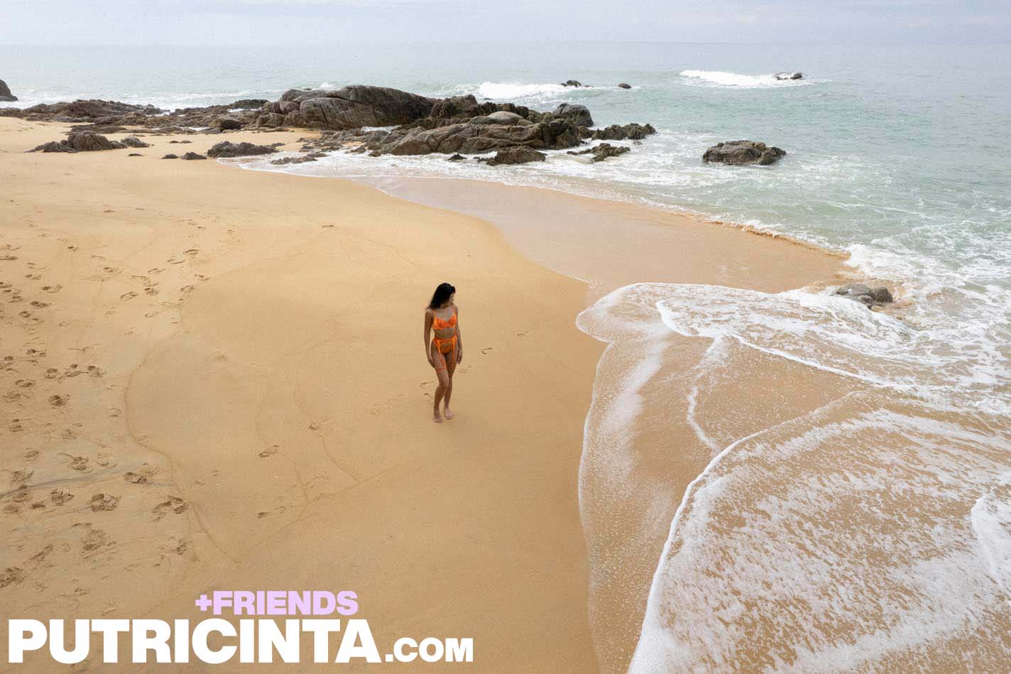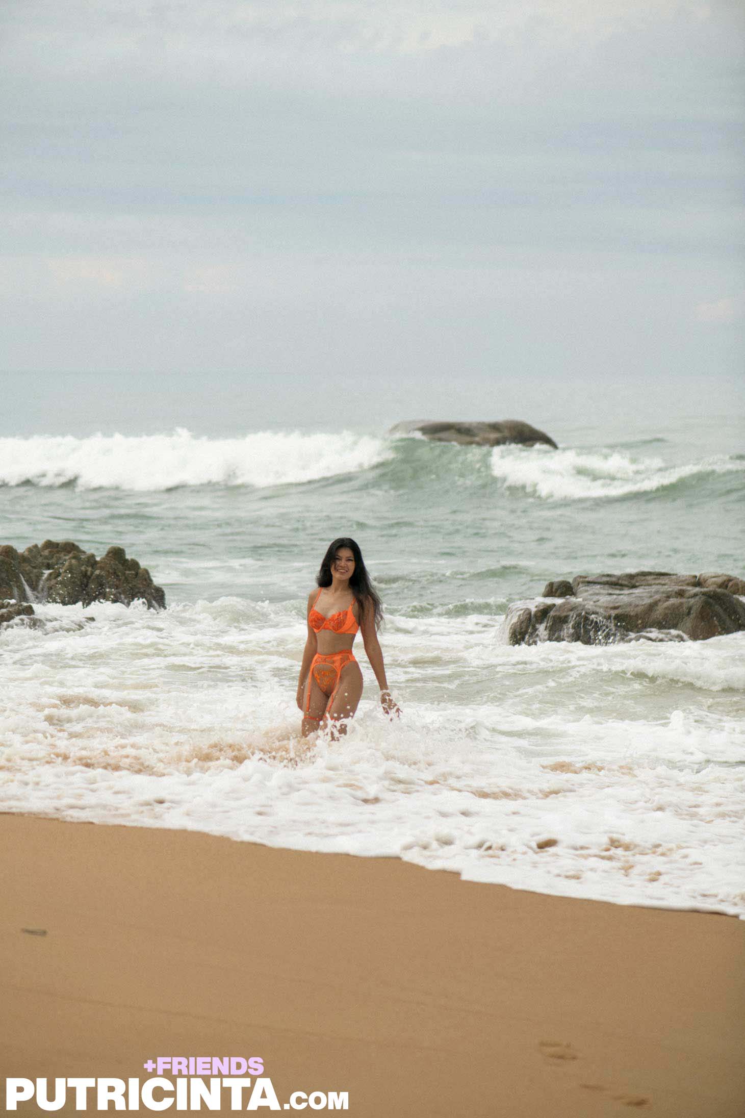 Kathai poses in orange lingerie right on the sand with the ocean behind her. She takes it all off and gets nude by the rocks and waves with her ass and black hair on full display.