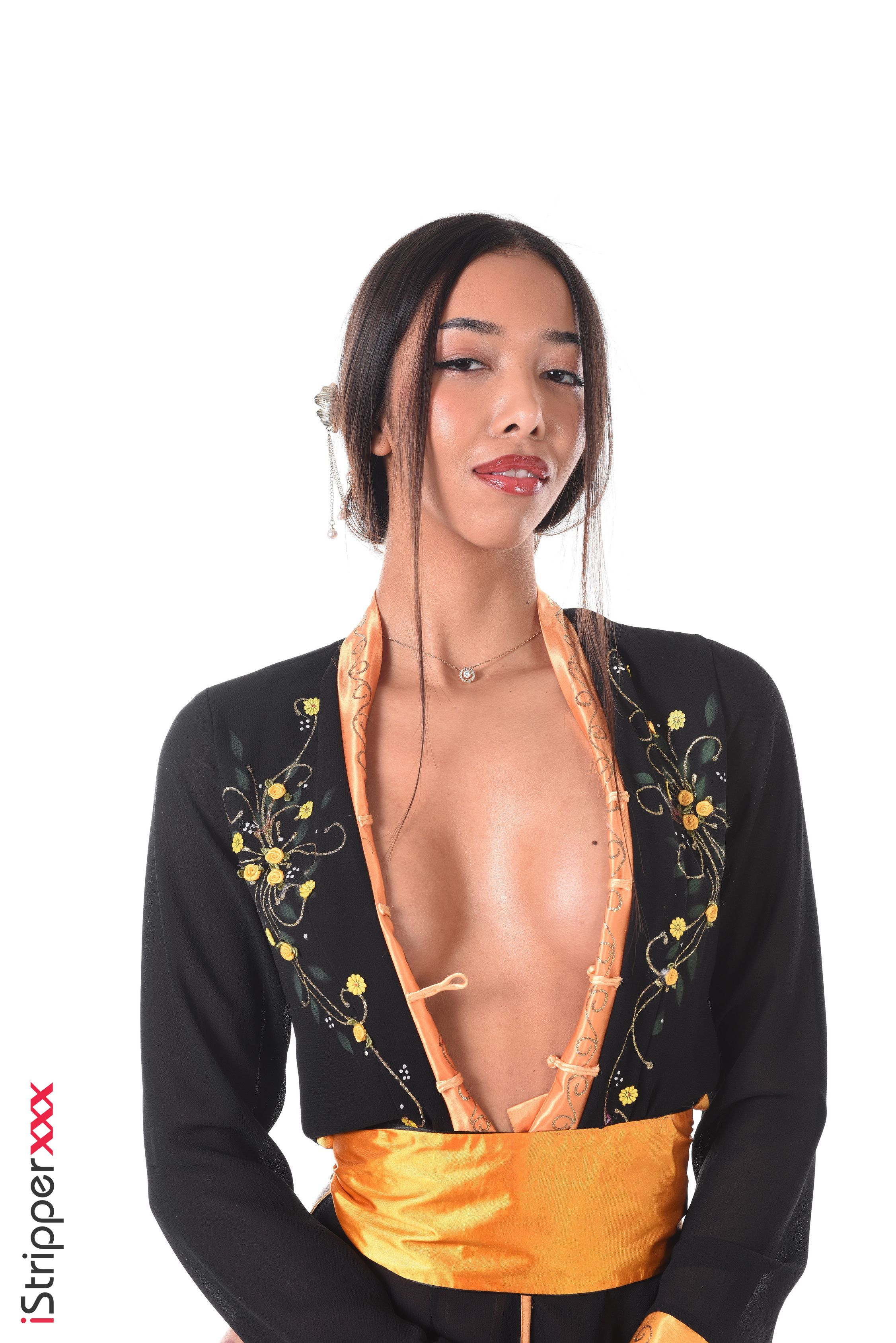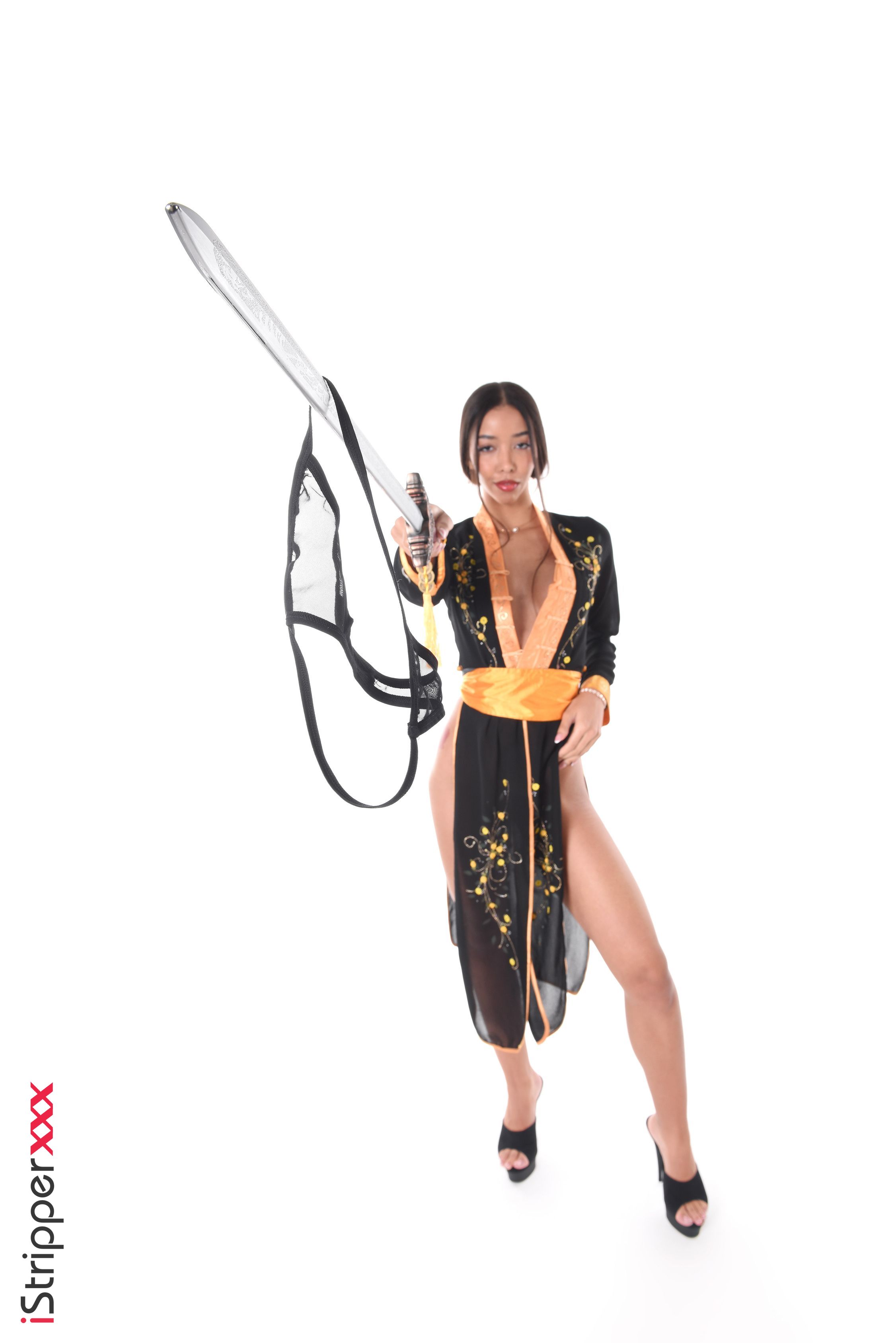 Lia Lin wears a black kimono and holds a sword while in high heels. She takes it off to get naked and shoves a dildo into her pussy.