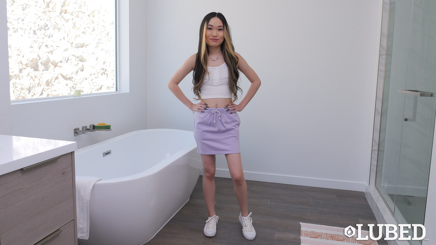 London Lee sits in the bathtub with her legs spread wide and rubs a purple toy on her pussy while smiling. She soaps up her body then sucks a guy's big cock before he bends her over for doggystyle and cowgirl. It ends with a sticky facial.