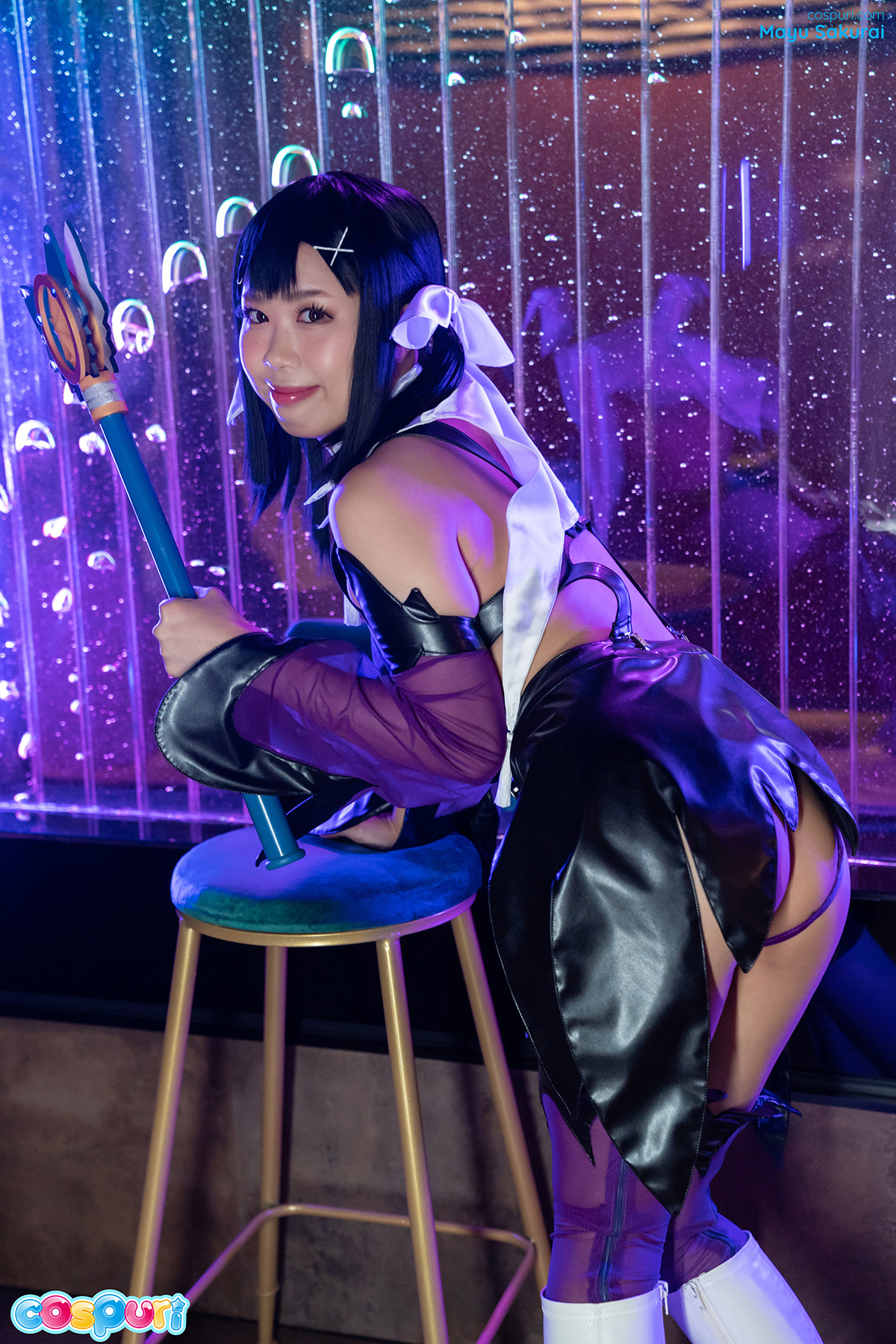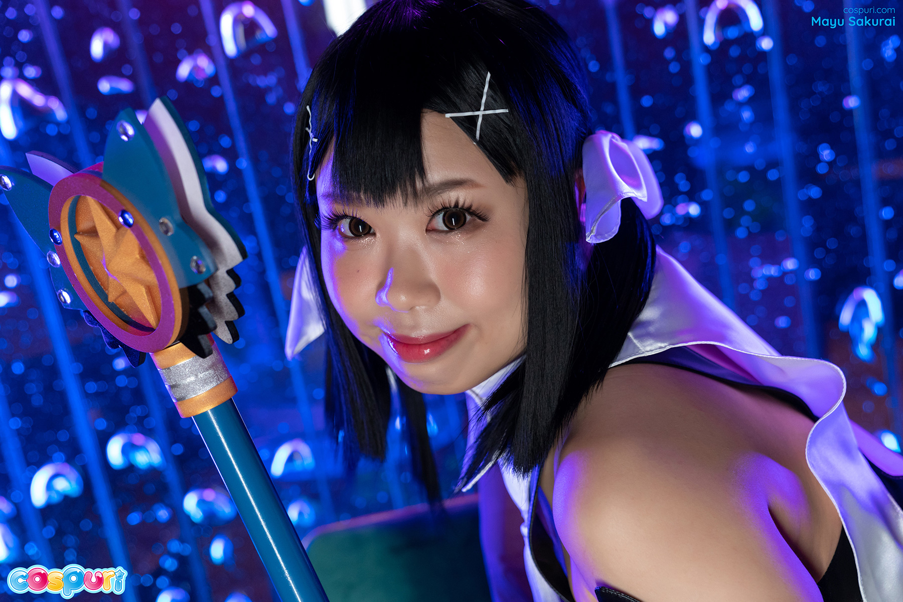 Mayu Sakurai is dressed in a sexy magical girl cosplay with a shiny purple thong. She pulls it aside, spreads her shaved pussy wide, plays with herself and gets super wet while smiling at the camera.