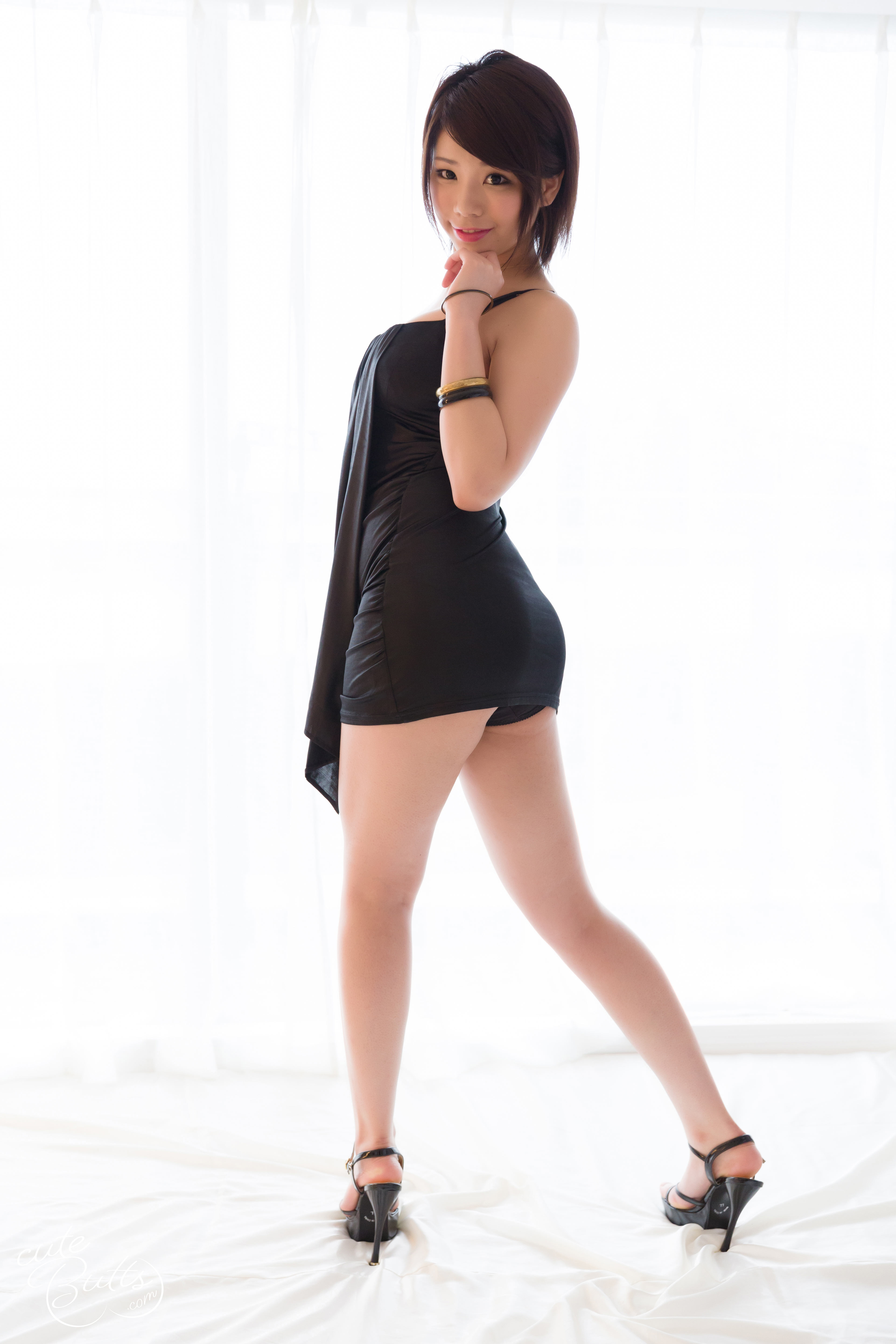 Mei Ashikawa looks super cute with her short black hair and sweet smile while posing in a bright bedroom. She wears a tight black dress and sexy high heels on the bed, lifting it up, bending over, and pulling her thong panties aside to show off her shaved pussy and tight asshole in closeup shots.
