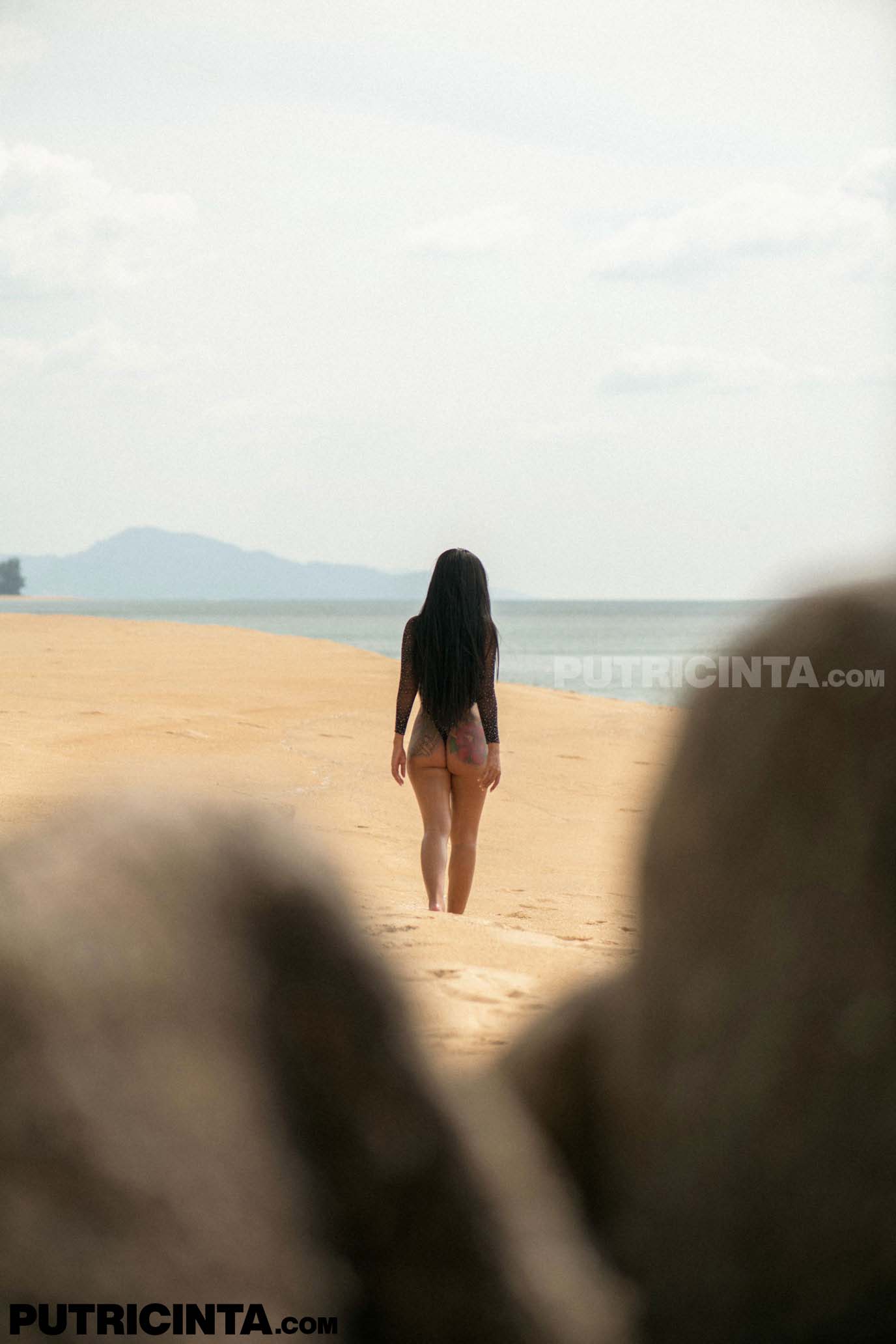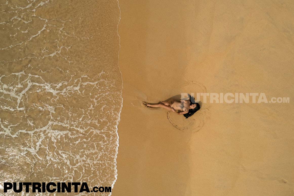 Misu poses without any clothes on the beach and has lots of tattoos on her body. She gets sand all over her skin while she lies down and stands near the sea in her black see through outfit too.