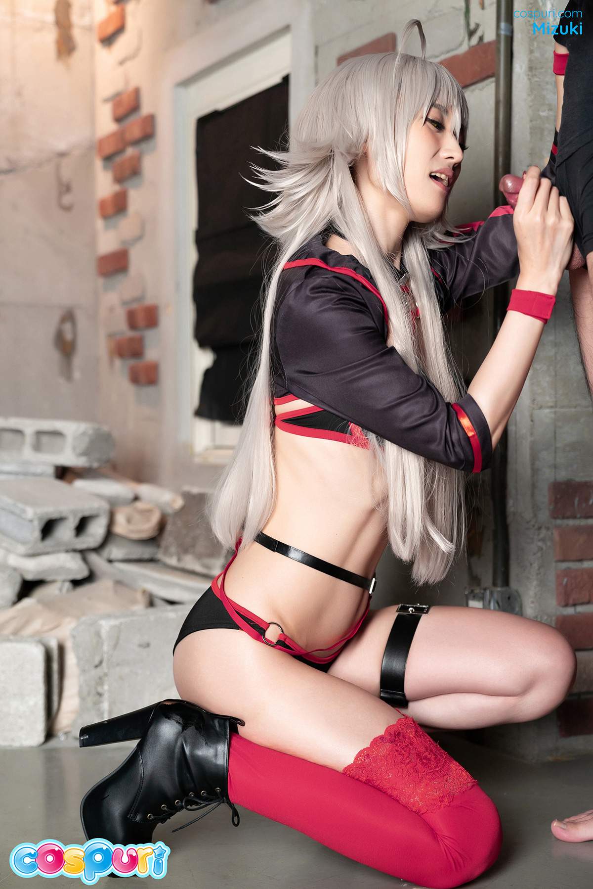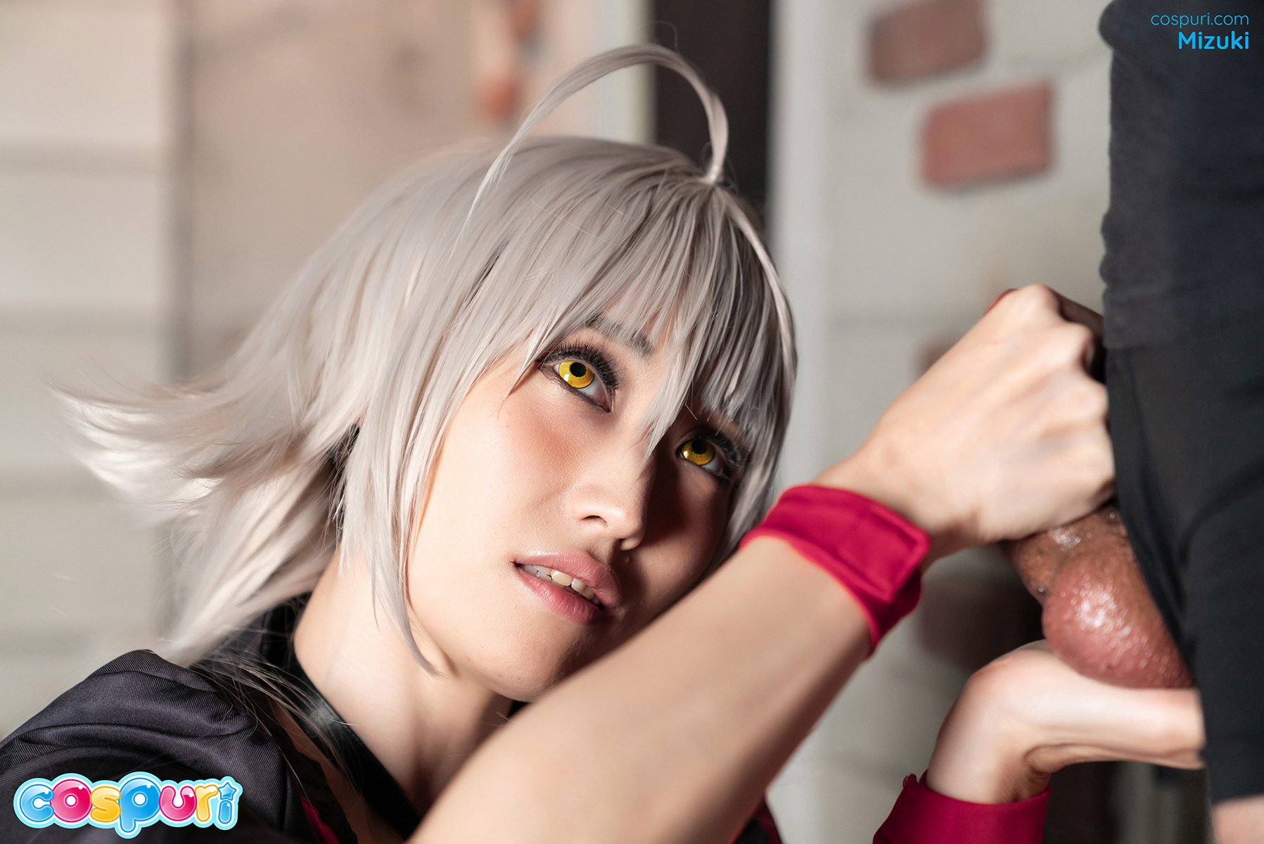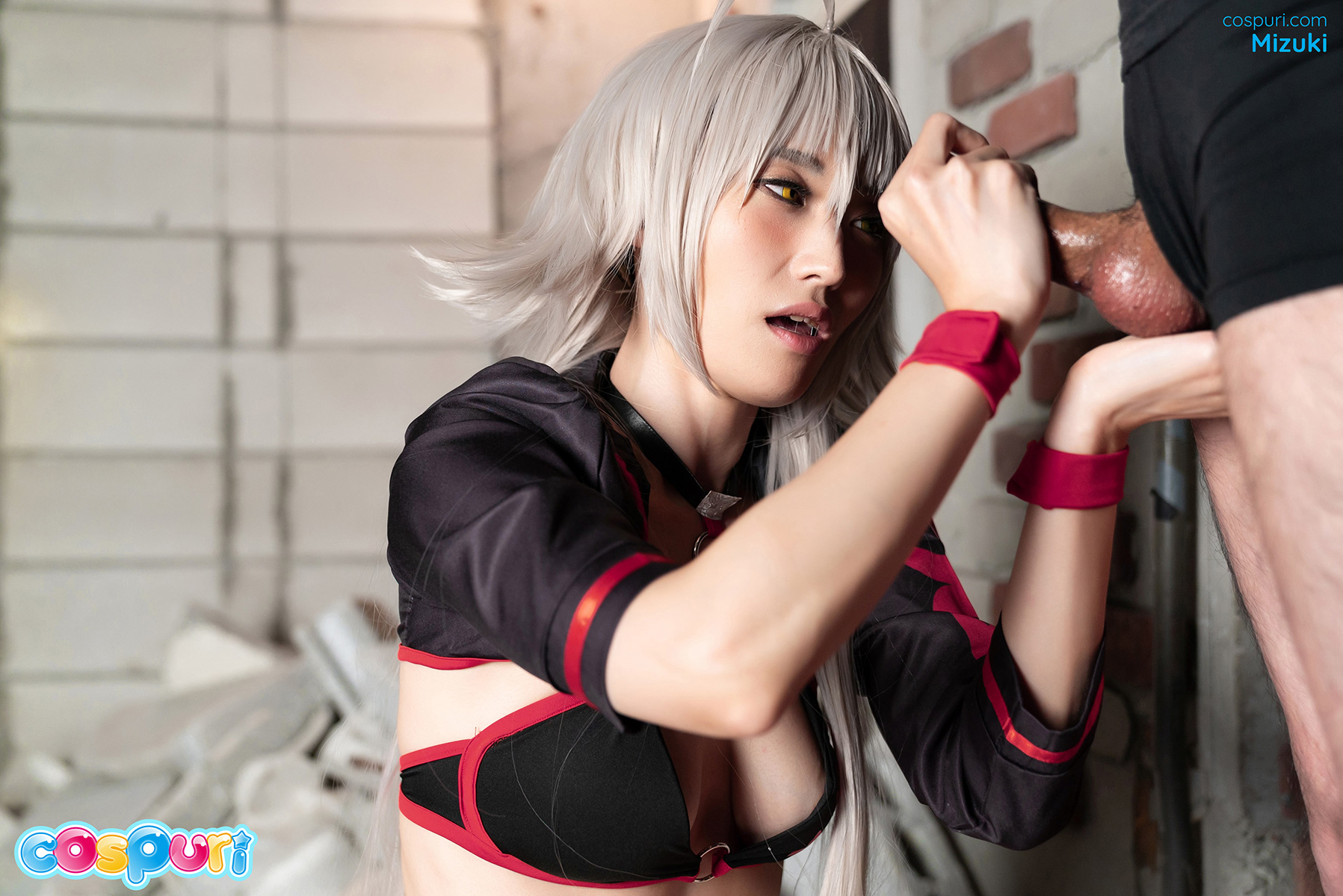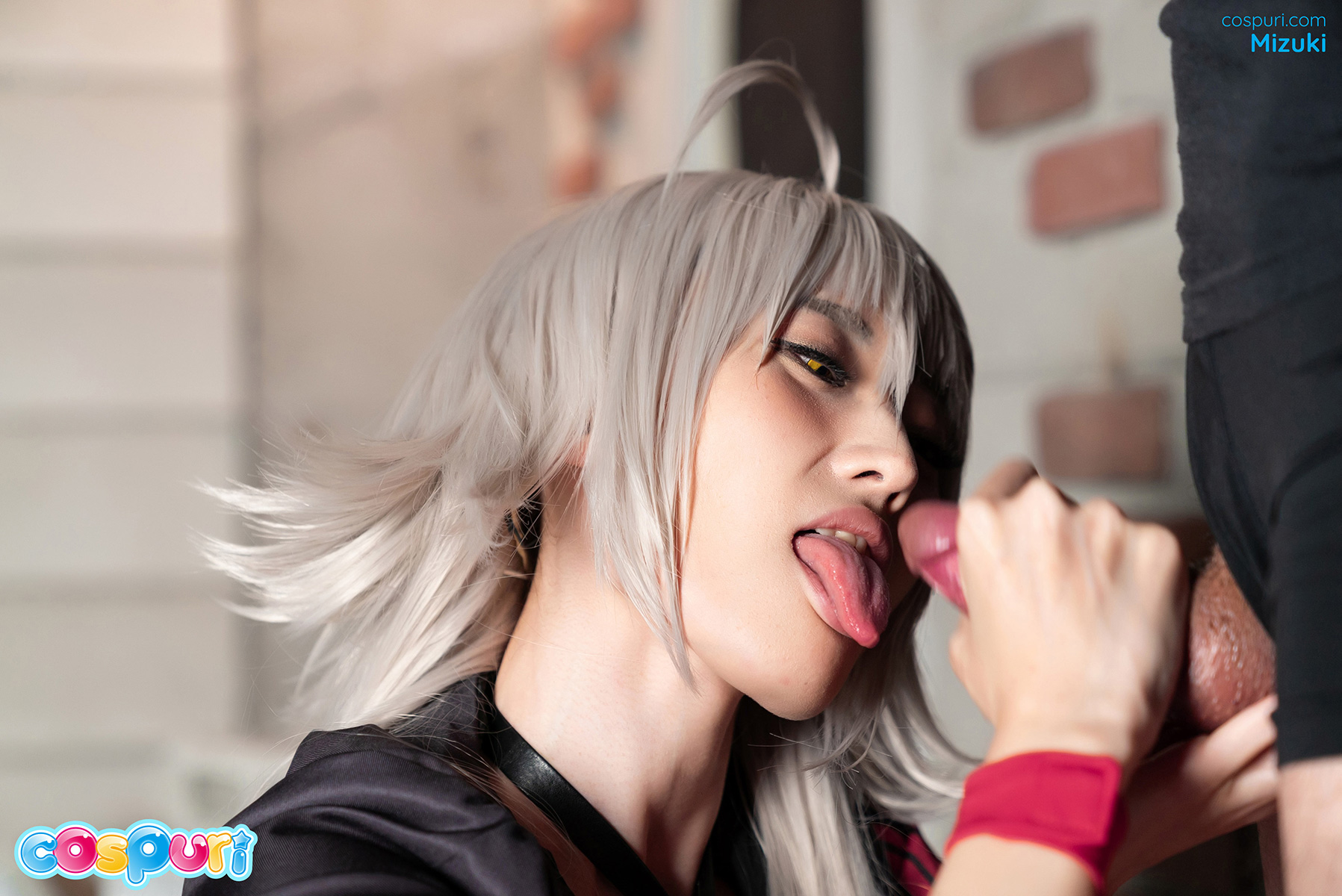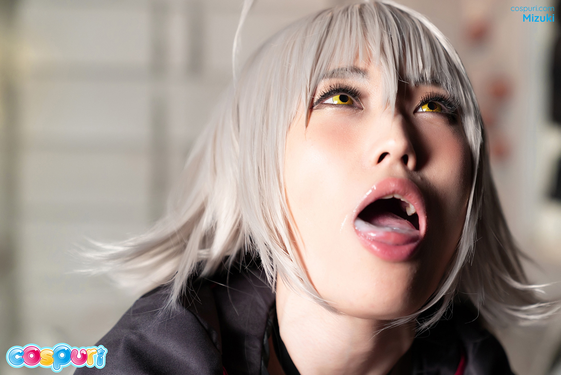 Mizuki looks super cute in her silver wig and yellow contacts as Jalter. She kneels and sucks cock deep with tons of drool, making wild ahegao faces before taking a thick cum load all over her tongue and face.