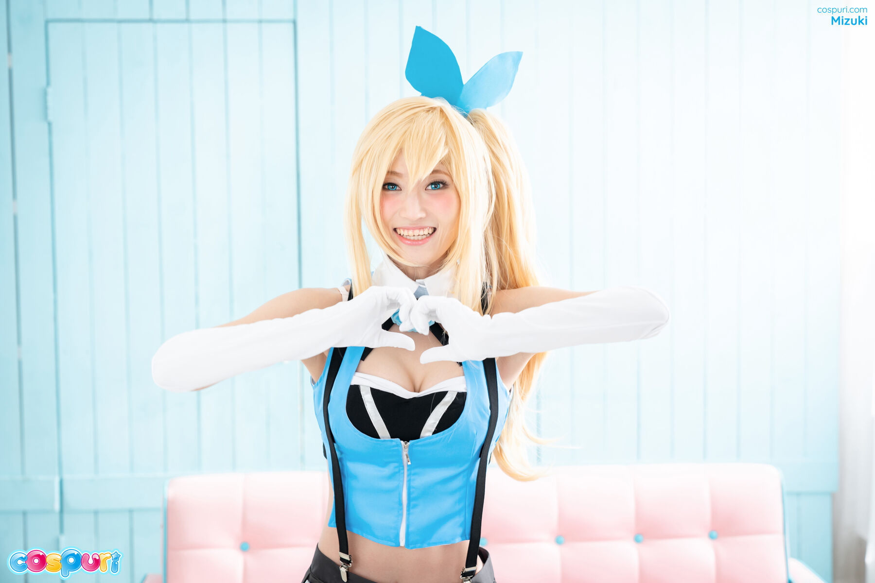 Mizuki wears a blue bunny outfit with gloves and stockings on a pink couch. She lifts her skirt to show her ass and pussy.