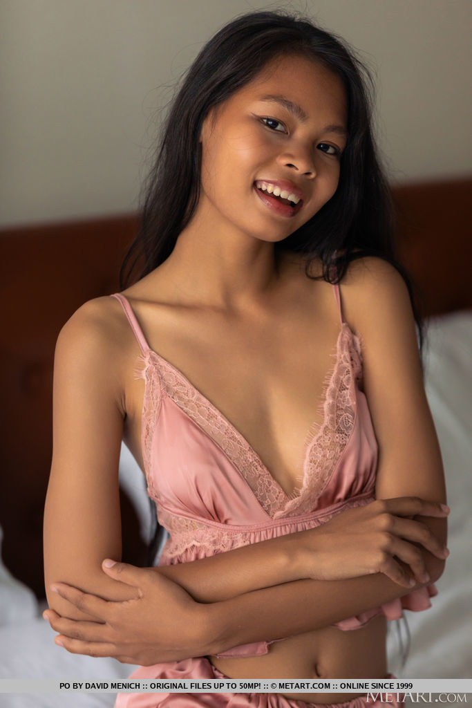 Por is a cute young Cambodian girl with long black hair, small tits and a slim body. She starts in pink lingerie on the hotel bed, strips fully nude while smiling, then spreads her legs wide and poses to show her shaved pussy and ass in closeups.