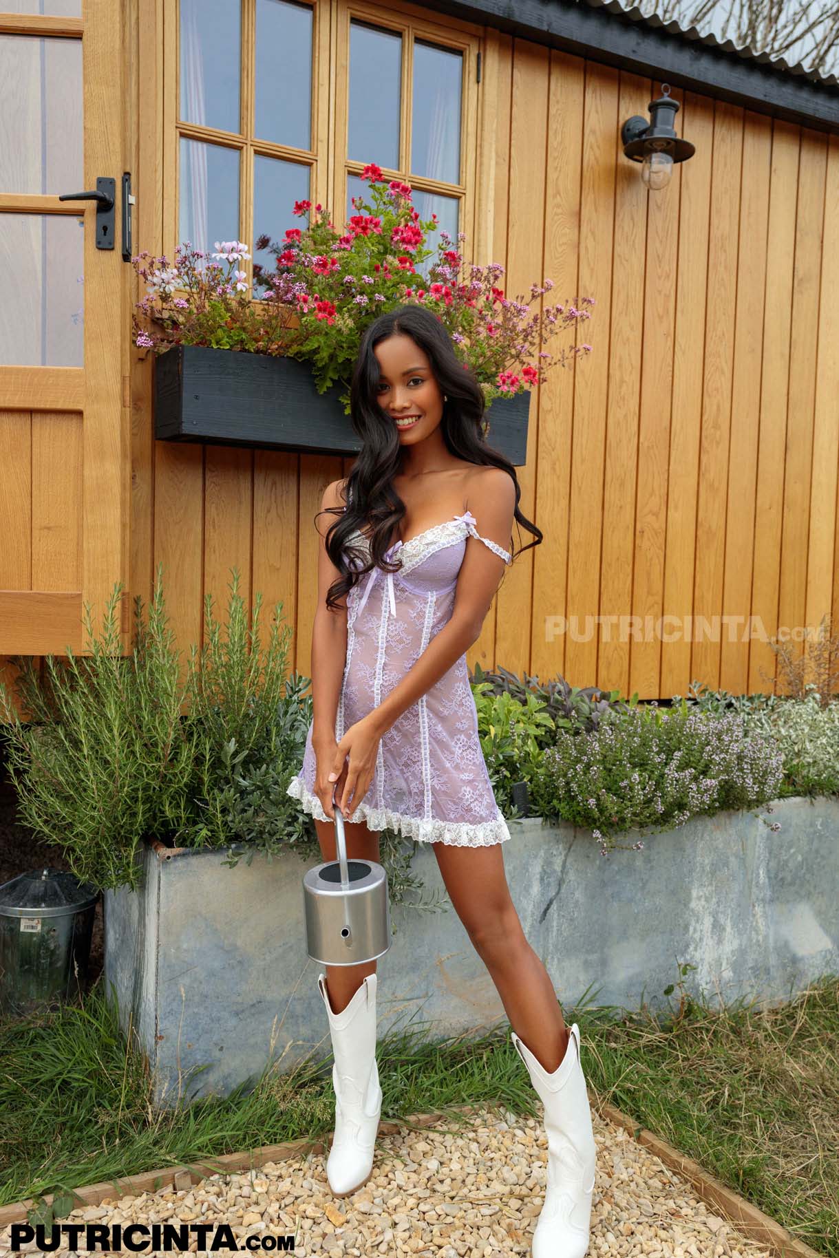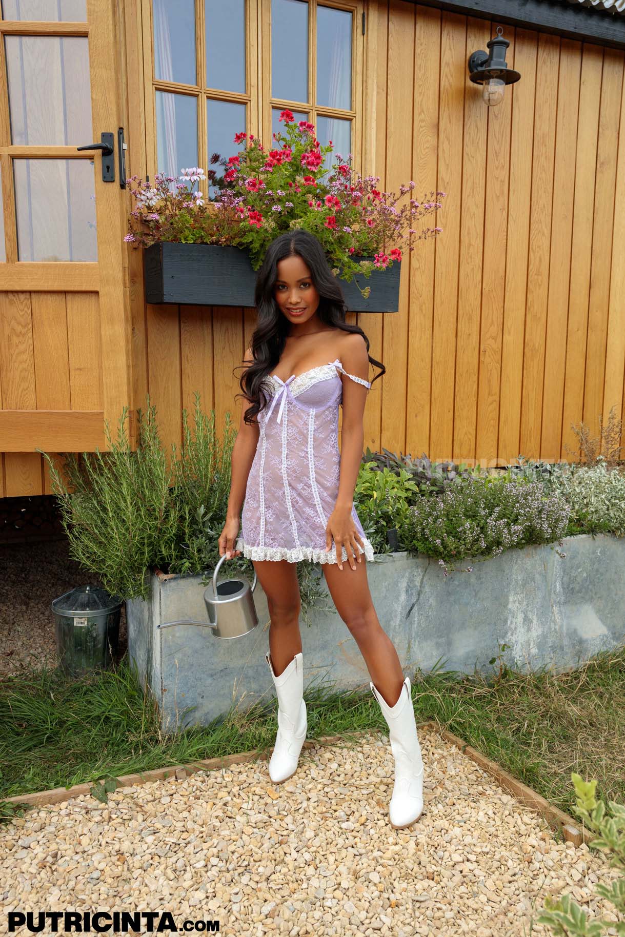 Putri Cinta is posing in a tiny purple lace lingerie dress and white cowboy boots in the garden. She pulls down the top to show her big naked tits and hard nipples while watering plants and smiling big.