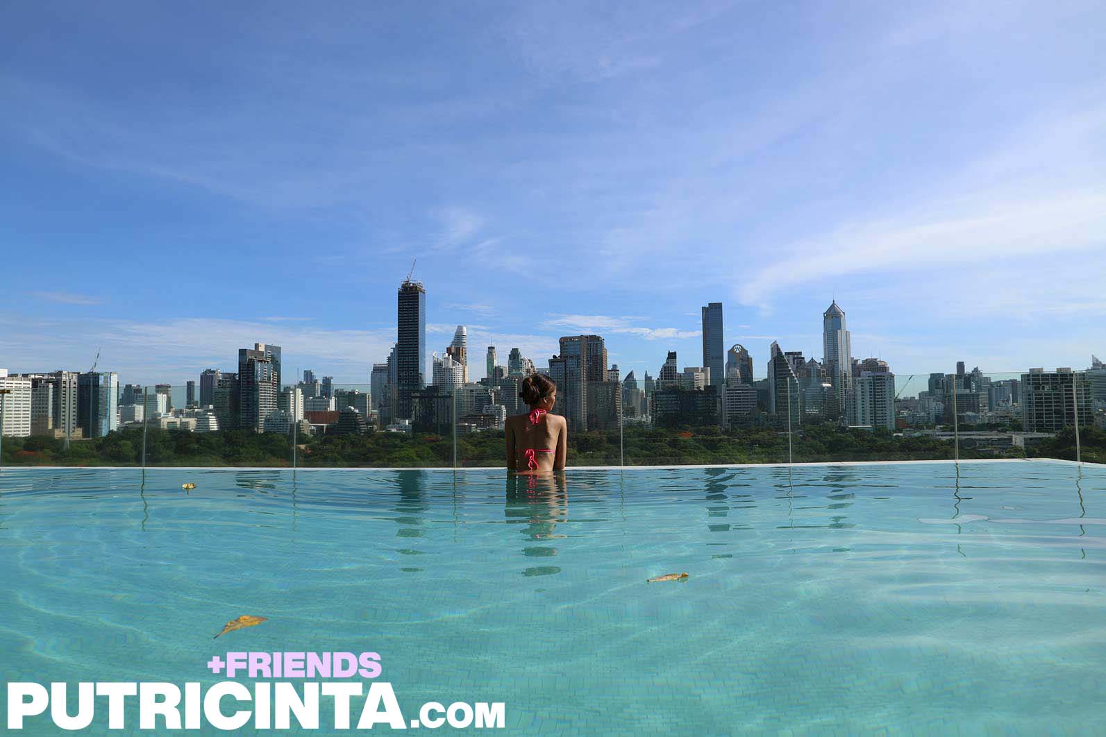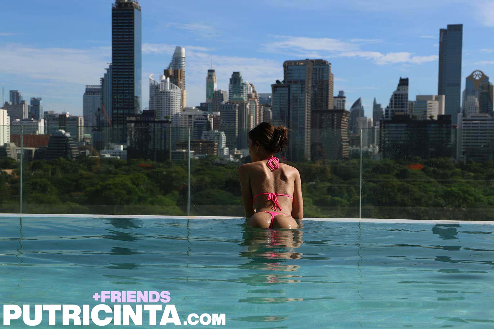Sasha Lin kneels naked by the tub showing her ass and feet. She lies in water with her tits out and poses in bikinis near pools.
